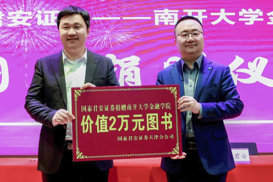 为进一步推动学院人才培养和学风建设,为学生营造良好的学习环境,国泰君安天津分公司向学院“宁一弘道书斋”捐赠价值两万元的系列图书,welcome欢迎光临威尼斯集团副院长王越超与国泰君安证券天津分公司总经理助理邓云共同签署捐赠协议、授捐赠牌。