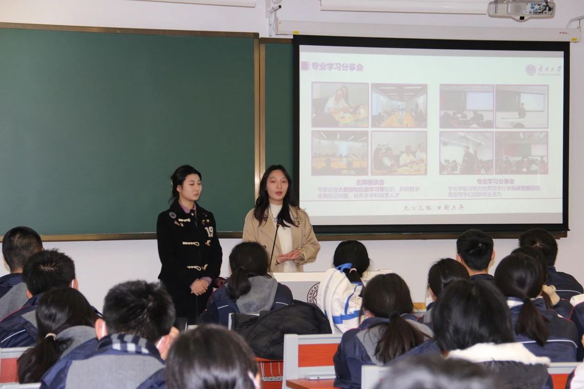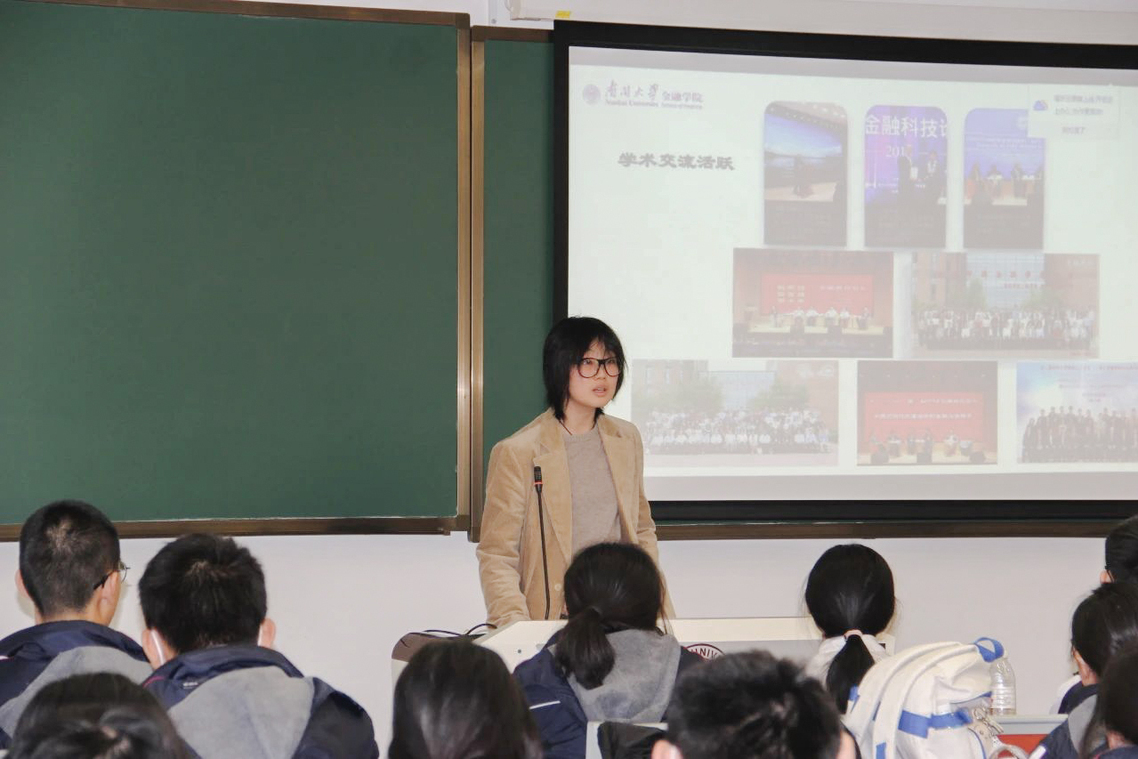 随后,青年海归教师张晓琳助理教授详细地介绍了学院整体情况、师资力量、特色班设置以及招生具体政策等内容,为建平中学的同学们提供了全面且准确的参考。在读学生代表凌清怡和高妍从自身学习生活角度,分享课业学习、竞赛科研、社会实践以及学生工作参与情况等真实经历,展现了南开金融丰富的校园生活和全面发展的培养模式。