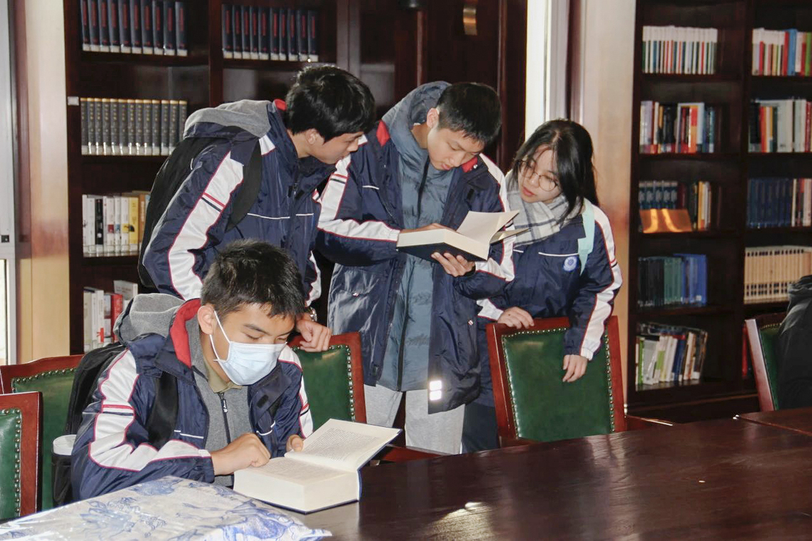 随后,师生们参观宁一弘道书斋。在讲解员的引导下,建平中学的同学们认真聆听讲解,并纷纷寻找并阅读感兴趣的书籍,当场即津津有味地“沉浸式”阅读、讨论起来,为学院浓厚的学术氛围增添一份活力。
