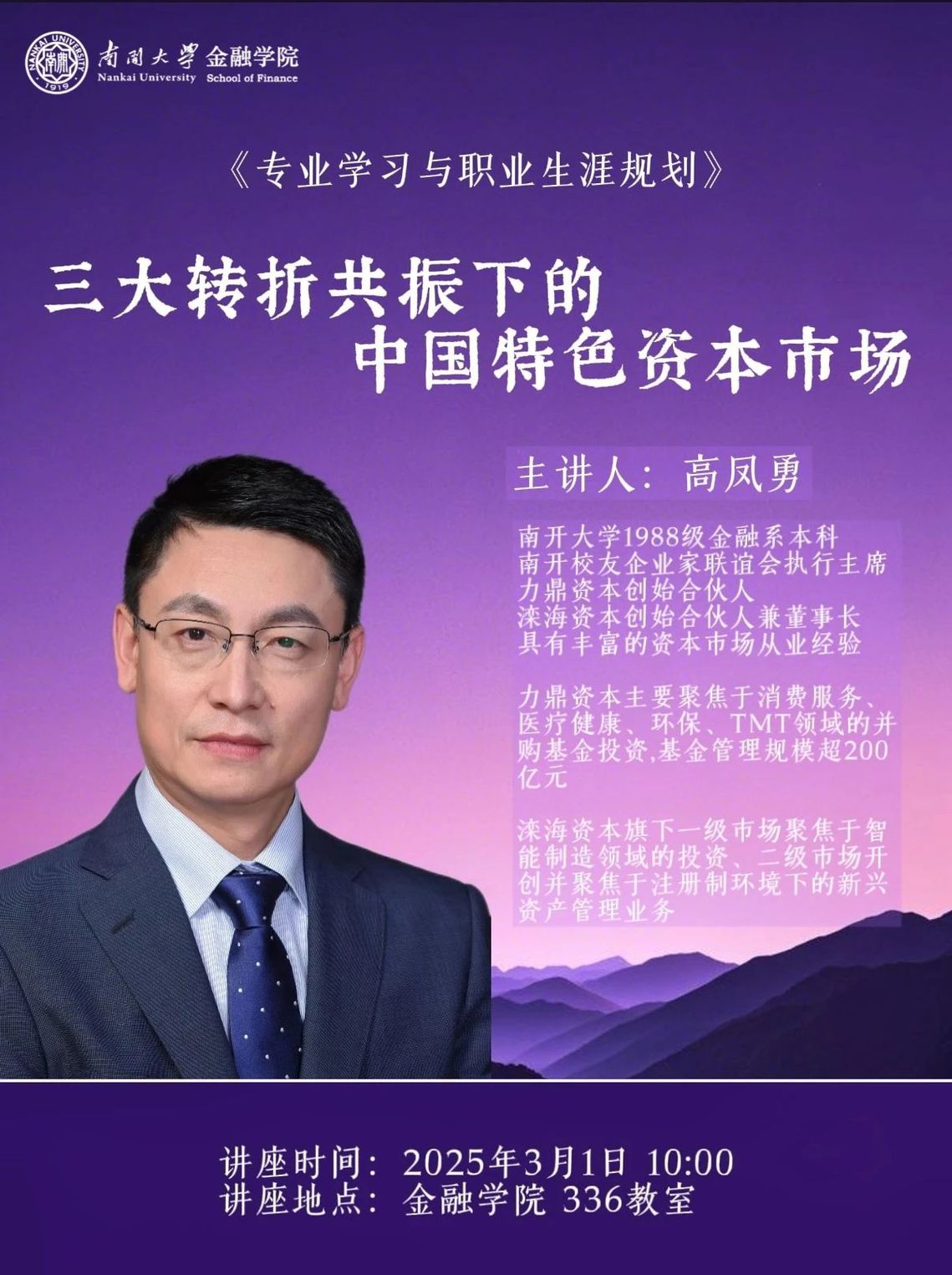 高凤勇校友具有丰富的资本市场从业经验,力鼎资本主要聚焦于消费服务、医疗健康、环保、TMT领域的并购基金投资,基金管理规模超200亿元。滦海资本旗下一级市场聚焦于智能制造领域的投资、二级市场开创并聚焦于注册制环境下的新兴资产管理业务。高凤勇校友积极支持南开金融教育事业,发起“八里台金融论坛”活动,成为南开上海校友会年会经典活动。著有《金融不虚——新三板的逻辑》、《星榜:资本变局与科创革命》两部专著。