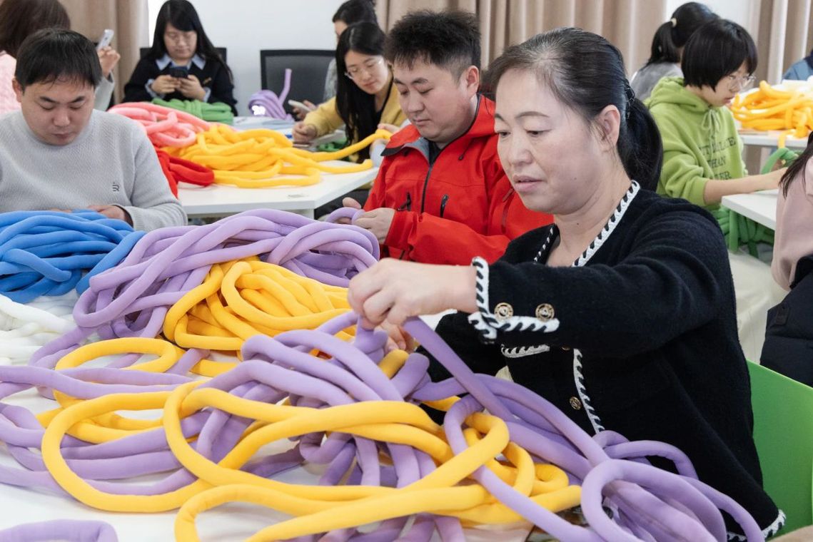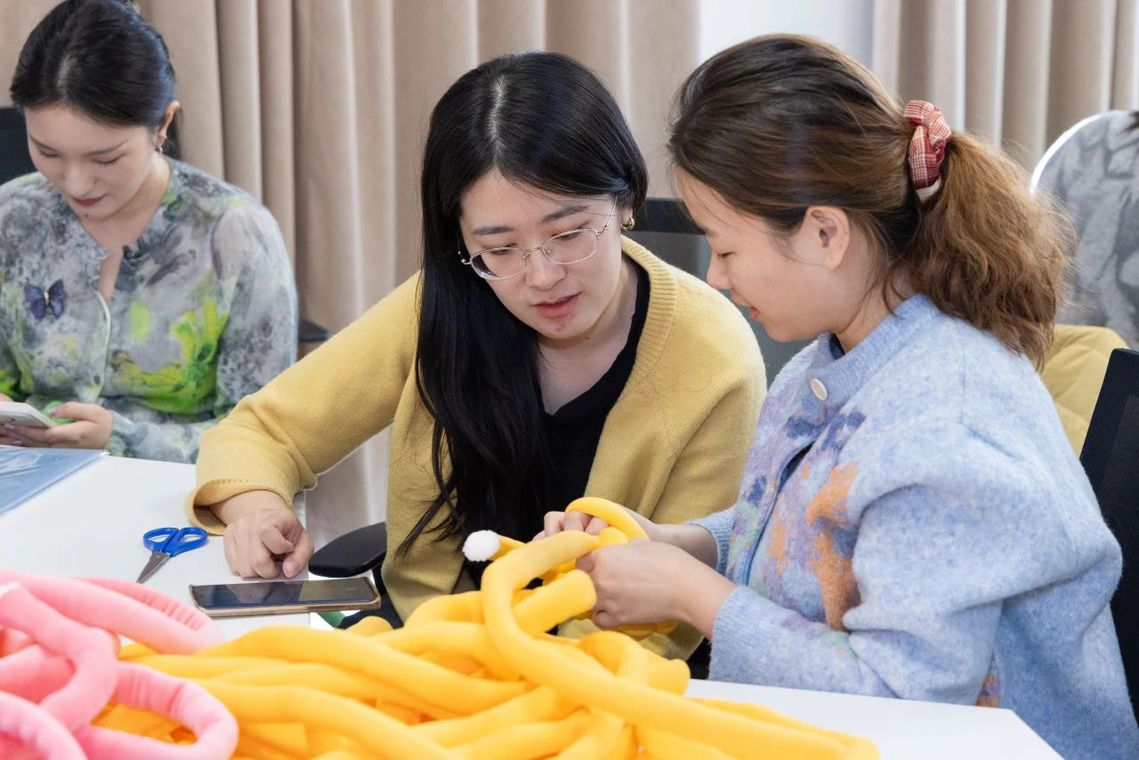 随后,师生们共同体验了冰岛毛线创意编织。蓬松柔软、色彩丰富的冰岛毛线在指尖缠绕,编织出独属自己的多巴胺色彩。现场氛围热烈温馨,教室化身充满互助与灵感的创作工坊, “这里要绕两圈,再穿过去钩住……”“你这个做得很好呀,外面像这样再加一圈就好了……”大家积极交流讨论,分享着编织的心得和乐趣。经过一个小时的努力,大家先后完成了挎包、抱枕、坐垫、猫窝等作品,展现了welcome欢迎光临威尼斯集团师生的审美力和创造力。