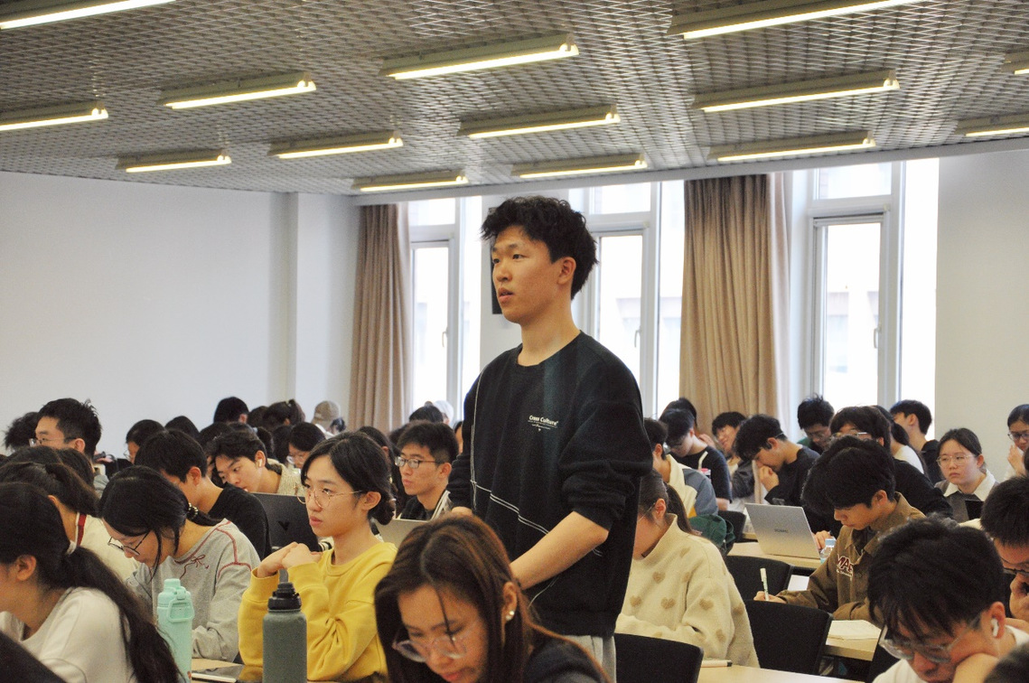 课前,许一村睿杰同学代表所在小组,就私募股权投资基金进行了精彩的展示。他详细分享了私募股权投资的四个主要阶段及其各自的特点,为同学们提前梳理了相关知识框架,也为李皓鹏校友随后的讲解做了充分的先导铺垫。此外,许一村睿杰同学还结合了欧盟碳关税、生物制造与半导体产业格局等近期热点话题,向李皓鹏校友提出了针对性的问题。在课堂上,李皓鹏校友对这些问题进行了逐一解答,深入浅出地为同学们剖析了私募股权投资在当前经济形势下的实际应用与发展动态。