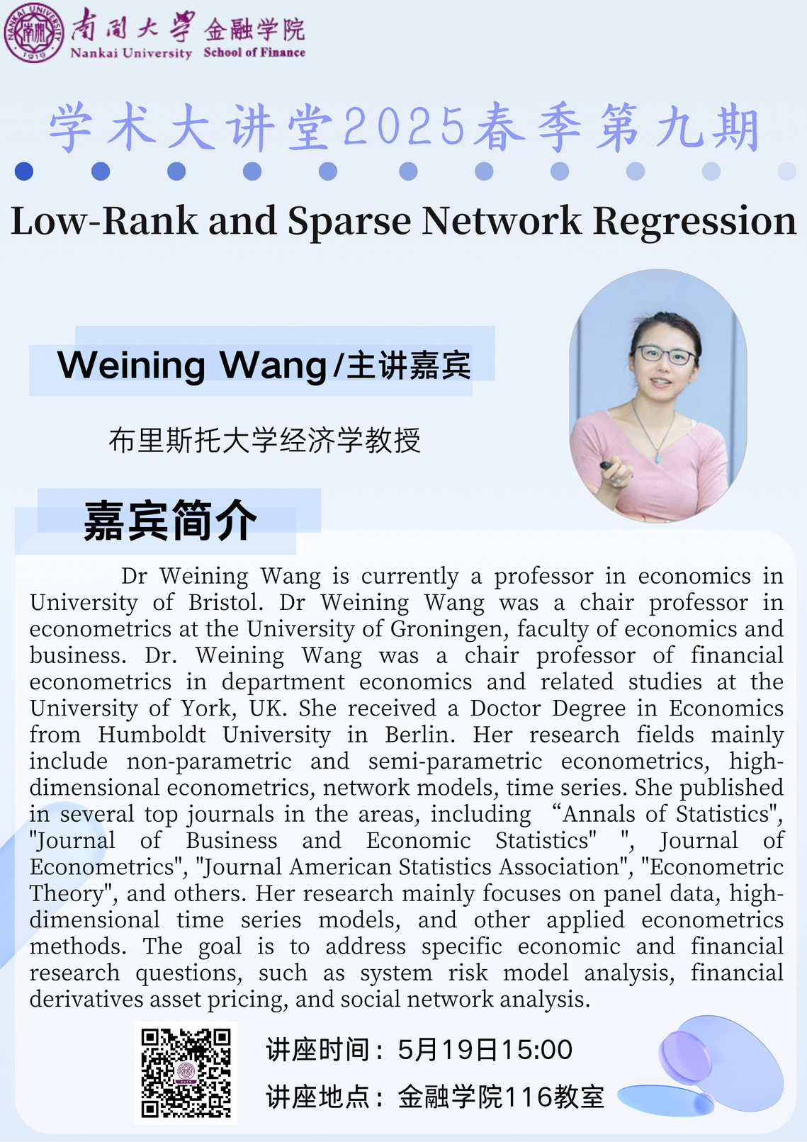 Dr Weining Wang is currently a professor in economics in University of Bristol. Dr Weining Wang was a chair professor in econometrics at the University of Groningen, faculty of economics and business. Dr. Weining Wang was a chair professor of financial econometrics in department economics and related studies at the University of York, UK. She received a Doctor Degree in Economics from Humboldt University in Berlin. Her research fields mainly include non-parametric and semi-parametric econometrics,high-dimensional econometrics, network models, time series. She published in several top journals in the areas, including “Annals of Statistics, Journal of Business and Economic Statistics , Journal of Econometrics, Journal American Statistics Association, Econometric Theory, and others. Her research mainly focuses on panel data, high-dimensional time series models, and other applied econometrics methods. The goal is to address specific economic and financial research questions, such as system risk model analysis, financial derivatives asset pricing, and social network analysis.