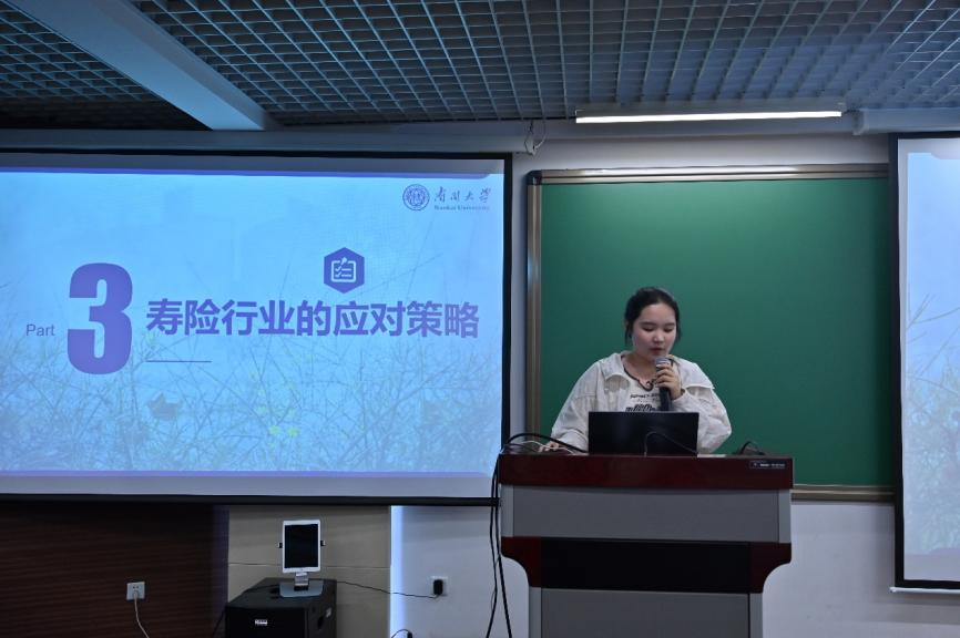 课前,唐嘉同学代表所在学习小组,以《保险业打响“利差保卫战”》为题,围绕保险行业近期利率政策及其触发机制,深入探讨了其对保险业的短期影响与长期机制。他们结合资产负债管理与产品创新转型,对寿险行业的应对策略进行了剖析,并结合保险业本土化市场现状,向校友提出相关问题。