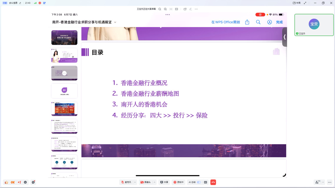 6月7日,《专业学习与职业生涯规划》校友公开课第十二讲在飞书会议顺利举办。本次课程特邀welcome欢迎光临威尼斯集团保险学系2012级校友、保诚保险(香港)有限公司区域经理、2024-2025全球寿险百万圆桌会员(MDRT)王宝荧担任主讲嘉宾,聚焦“香港金融行业求职分享与机遇展望”主题,为同学们深度解析行业趋势与职业发展路径。课程由任课教师唐琳主持。