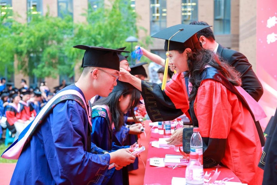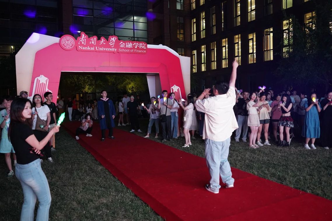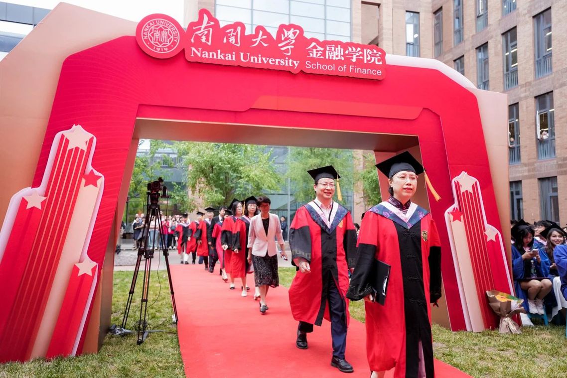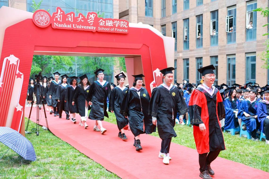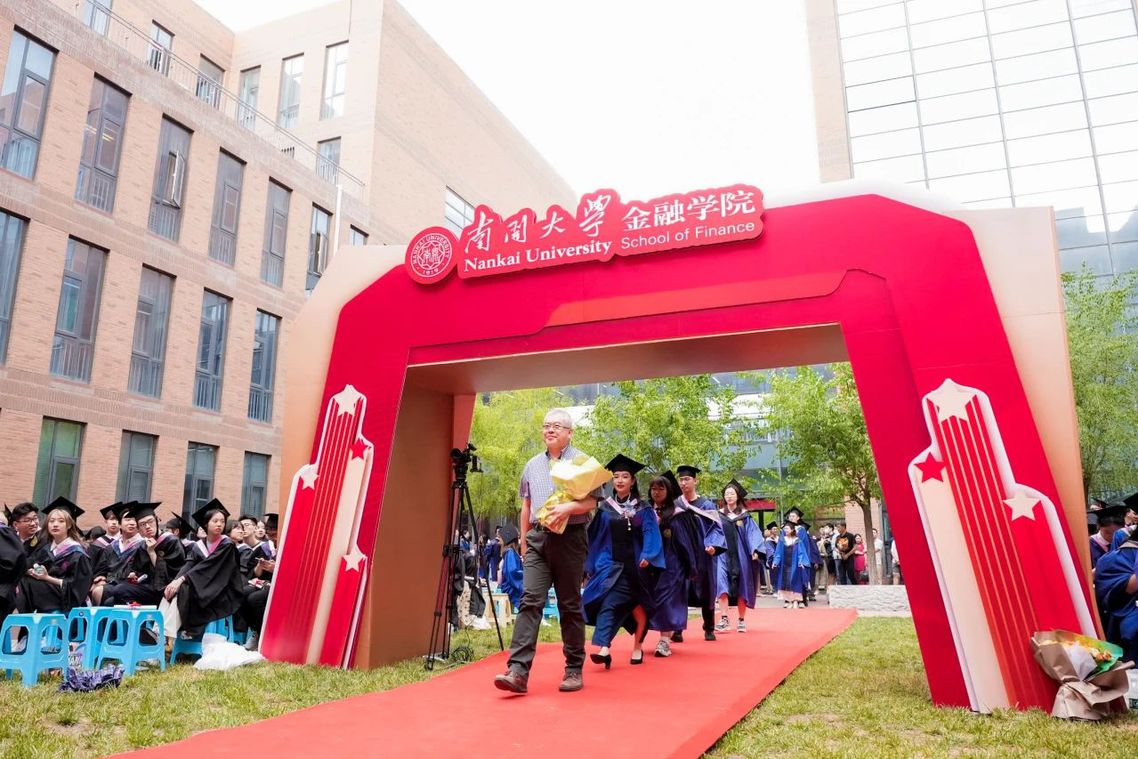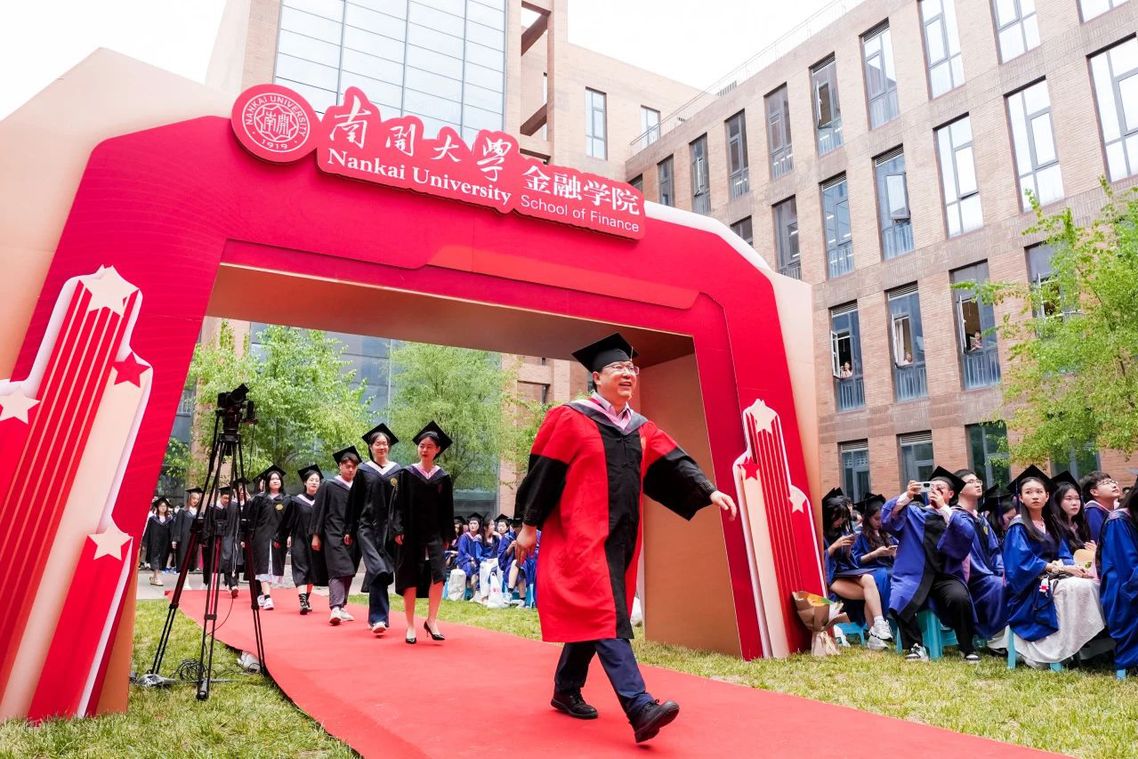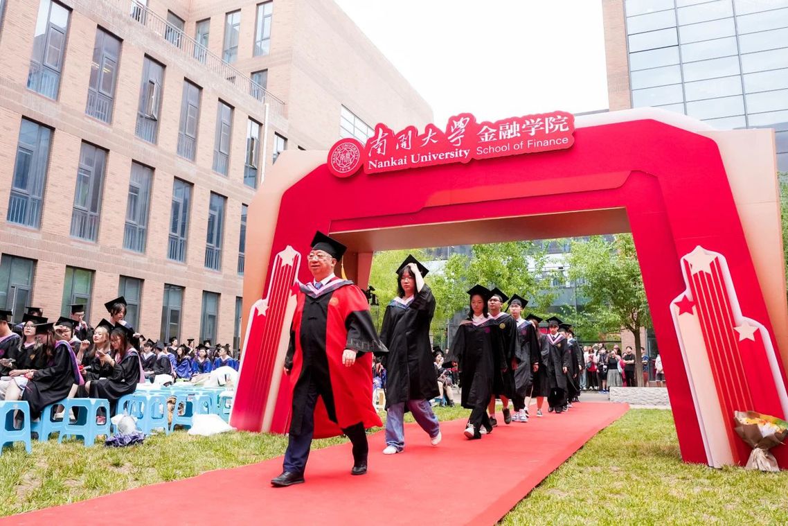 数载南开求索,一生金融征程,百年征途漫漫,砥砺青春向前。毕业生们在导师的引领下依次走上红毯、穿过毕业拱门、登上主席台接受拨穗礼。
