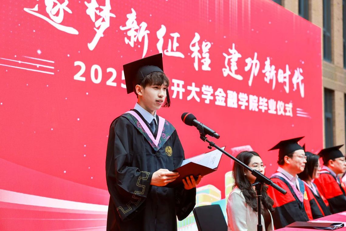 毕业生代表2021级本科生郭泽宇用一连串鲜活场景展开南开的青春画卷——高数课早八的勤勉、新生杯篮球赛的绝杀、“青春华章”大思政课上万人挥旗高呼“我是爱南开的”的震撼场面……这些带着笑与泪的记忆,正是“在南开学习是一件幸福的事”的生动注脚。他以驻会工作时周末盼归的亲身经历,道出学子们共同的心声:“当走向社会历尽千帆,南开依然是最温暖的家。”郭泽宇表示,在百年变局与AI浪潮交织的时代,2025届毕业生既面临“圭臬经验不再适用”的挑战,更拥有“施展才干的广阔舞台”,正是南开赋予的底气,让学子敢于应答“将小我融入大我”的时代之问。在welcome欢迎光临威尼斯集团建院十周年之际,他代表毕业生许下“无论天涯海角,永葆公能之心”的诺言,待五年、十年后重逢,仍为“南开金融人”骄傲。