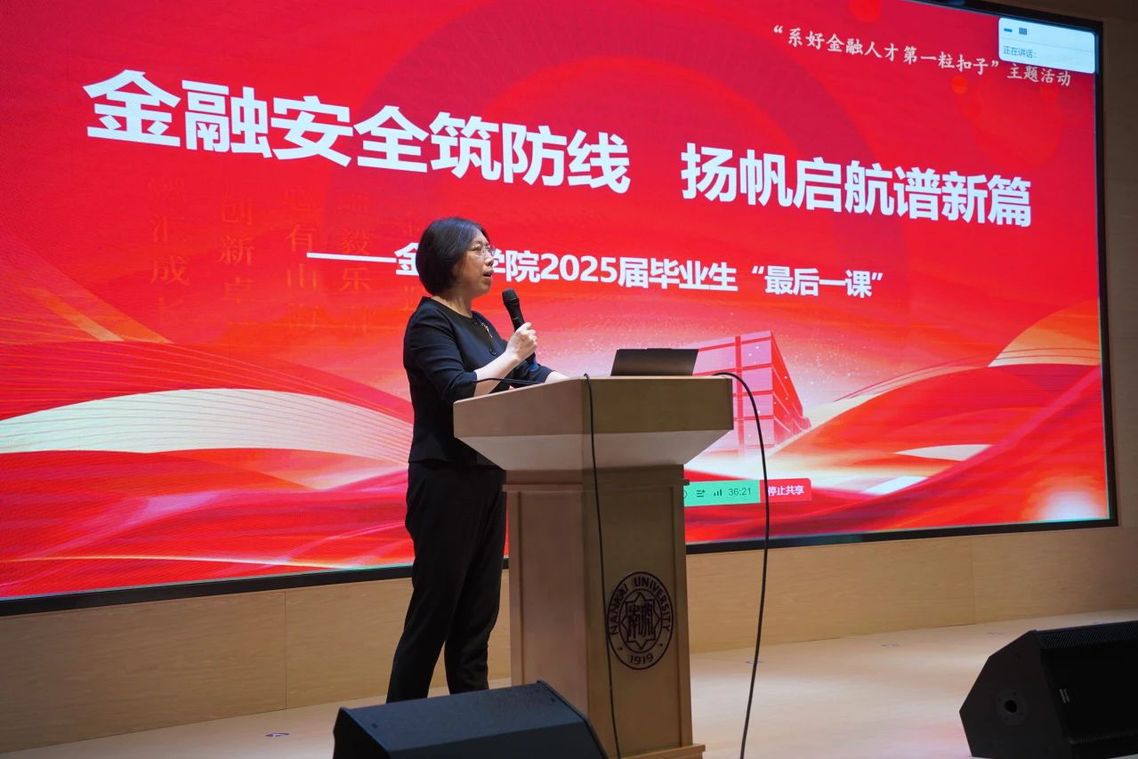 范小云在课程中强调,金融作为现代经济的核心,其安全稳定关系国家发展大局。洗钱活动作为一颗隐藏的“毒瘤”,扰乱金融秩序和社会稳定,同学们要深入了解反洗钱知识,掌握反洗钱技能,树立坚定的反洗钱意识。她呼吁毕业生们要始终将合规意识、风险意识、责任意识内化于心、外化于行,守护金融的纯洁性,用自己的专业知识和坚定信仰,为维护金融秩序稳定、保障国家经济安全贡献南开金融人的智慧与担当。