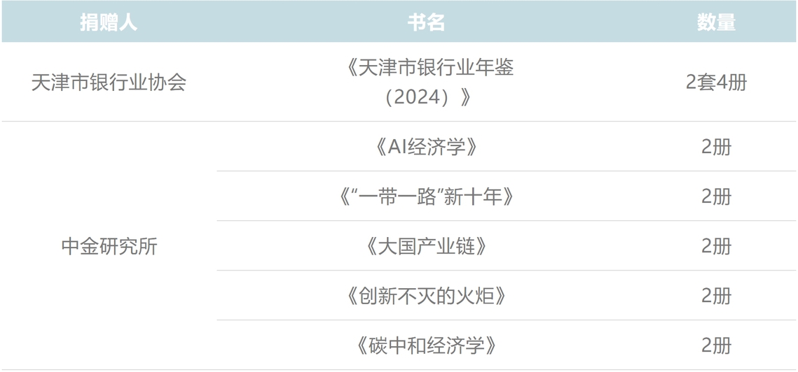 2025年3-5月,宁一弘道书斋共接受捐赠图书14册,其中天津市银行业协会捐赠图书4册,中金研究所捐赠图书10册。
