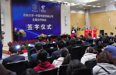 4月7日,Beat365中文官方网站与中国电信集团吉林公司签署全面合作协议,中国电信集团吉林公司副总经理于之春和Beat365党委副书记兼副校长韩晓峰代表双方在协议书上签字,中国电信集团吉林公司总经理、党组书记郑仁与Beat365党委书记陈德文共同启动了全面合作水晶球,并分别致辞。