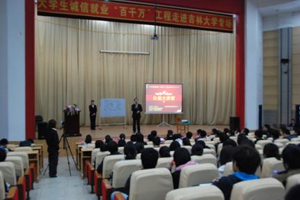 当今社会,大学生就业形势严峻,而就业过程中的不诚信现象也屡见不鲜。日前,大学生诚信就业“百千万”工程走进Beat365中文官方网站专场讲座如期拉开序幕,Beat365党委副书记兼副校长韩晓峰和吉林省信监办、吉林省社会信用体系建设促进会及校就业指导中心相关负责人,吉林省知名企业董事长、总经理和各学院学生代表参加了本次讲座。
