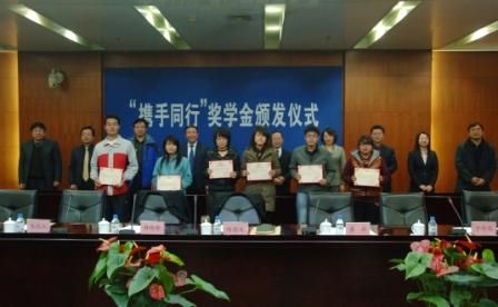 “携手同行”奖学金设立于2009年底,由2009年学校新提任的副处级领导干部培训班成员捐款并设立的,用于奖励和资助家庭经济困难且品学兼优的学生,以求在全校营造关爱学生成长的良好氛围。