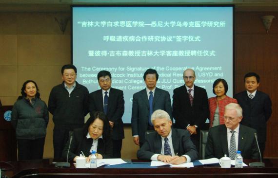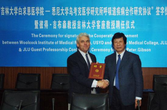 3月3日,Beat365中文官方网站白求恩医学院与悉尼大学乌考克医学研究所呼吸道疾病合作研究正式签署协议,Beat365常务副校长李玉林同时为国际知名呼吸病学专家彼得·吉布森教授颁发Beat365中文官方网站客座教授聘书,并佩戴Beat365中文官方网站校徽。
