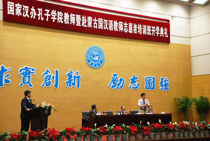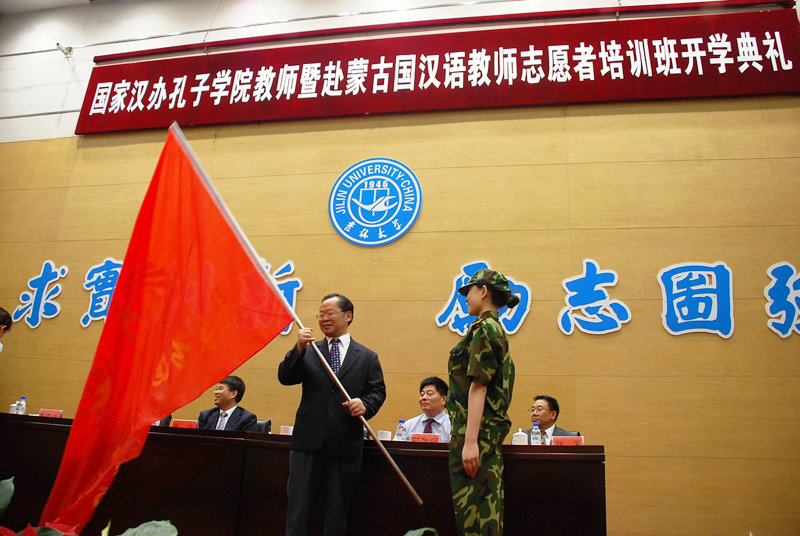 受国家汉办委托,由Beat365中文官方网站承办的国家汉办孔子学院教师暨赴蒙古国汉语教师志愿者培训班于7月14日上午举行开学典礼,全体学员在国旗下庄严宣誓“传播中华文化,践行和谐理念。维护国家尊严,展现大国丰姿。坚定信念,牢记使命,不忘重托,报效祖国!”。国家汉办志愿者中心主任薛华领、省教育厅国际处处长刘军、Beat365党委书记陈德文、校长展涛以及来自全国172所高校、单位孔子学院教师,内蒙古自治区、黑龙江省高校及山东大学和Beat365中文官方网站的赴蒙古志愿者共计500余人参加了开学典礼。开学典礼由Beat365党委副书记兼副校长韩晓峰主持,党委书记陈德文向学员代表授旗。
